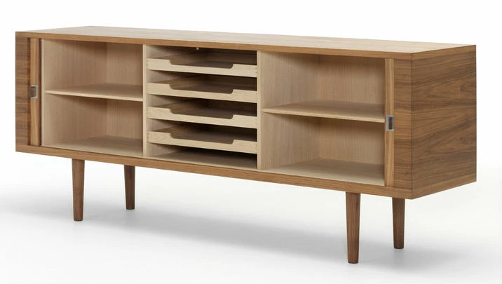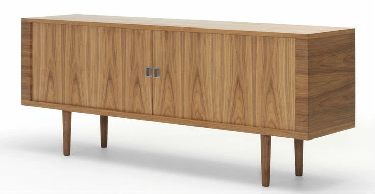 Designed by Hans J. WegnerManufactured by Carl Hansen & SonCarl Hansen & Son have relaunched, using original drawings from 1958, the CH825 Credenza to mark designer Hans J. Wegner’s 100th birthday. Although it appears simple, the credenza features an advanced design with roller shutter doors which run on a track and disappear when opened. The interior features adjustable shelves and pull-out drawers designed to enable simple installation of additional drawers.