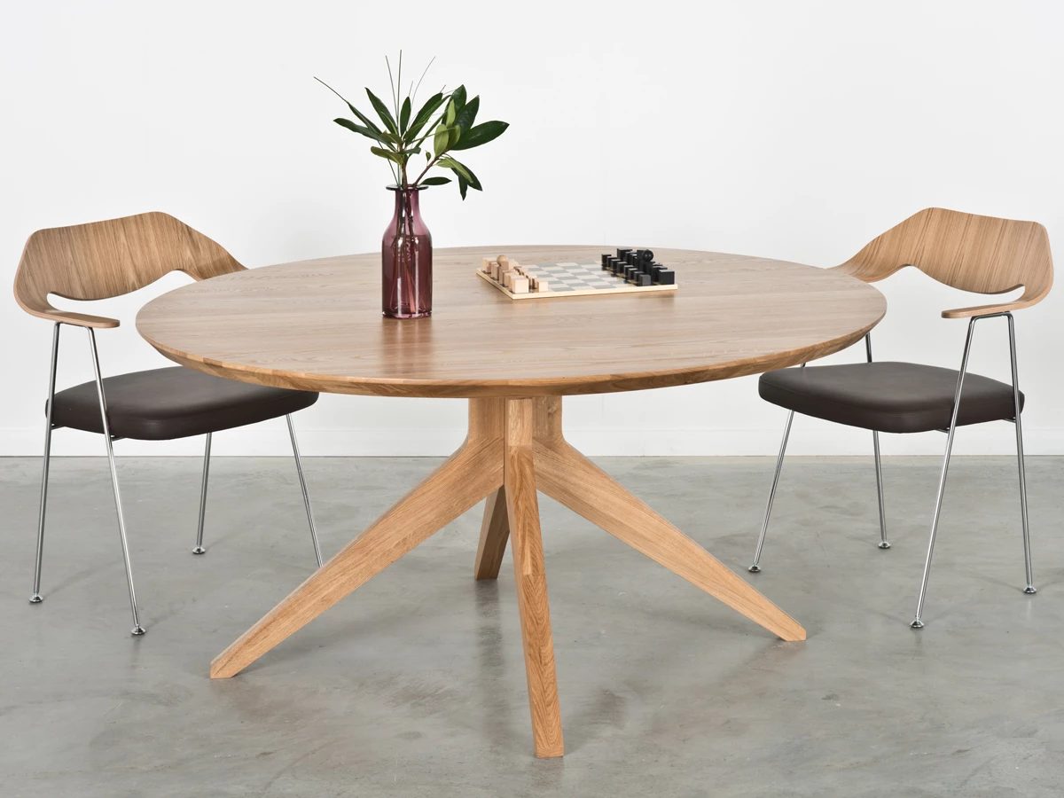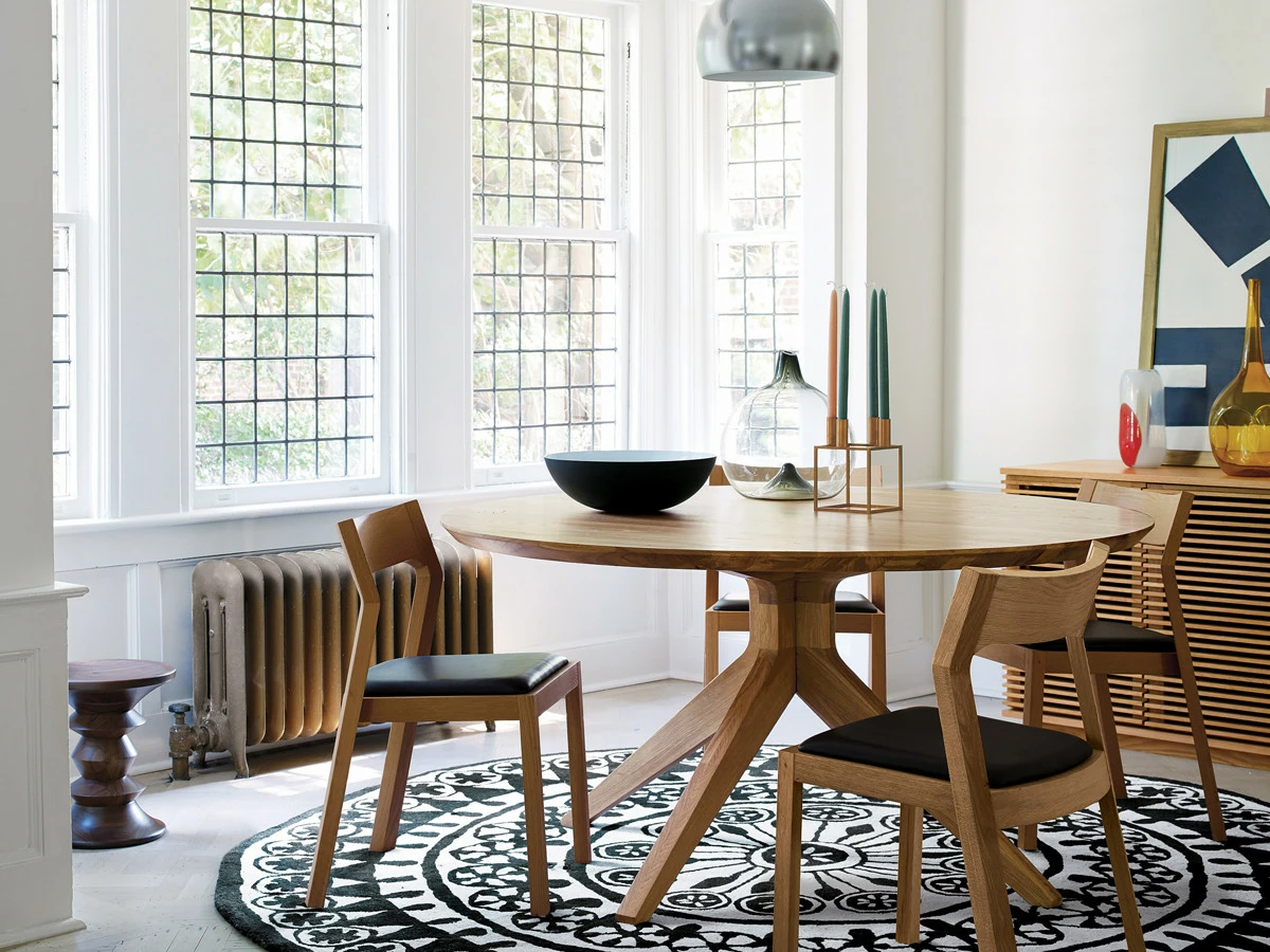Designed by Matthew HiltonManufactured by CaseThe Cross Round Table by Matthew Hilton is a distinct design that accentuates a very timeless look adorned by its fine details. It combines comfort with functionality while creating a contemporary piece of furniture to invest in your home. The unique lines and shape of this table makes it a very expressive piece making it the perfect centre piece in your room.It is made of solid wood complemented with a chamfered edge detail, which gives it a lightweight and simple aesthetic. Hilton’s signature splayed leg design provides an impressive amount of legroom and stability for a comfortable dining experience. This is a defining feature of the table making it an extremely practical item of furniture.It has a clear lacquer finish allowing the natural warmth of the wood to come through. This unique feature means minimal maintenance is required making it a very feasible furniture choice for the home. The Cross collection is a timeless, reliable design with award-winning products which distil the modern principles of design.With a sizeable sitting arrangement of 8 people around 1.5m table top, it is robust enough for family dining and even the smallest dinner parties. The Cross Round Table is available in oak.