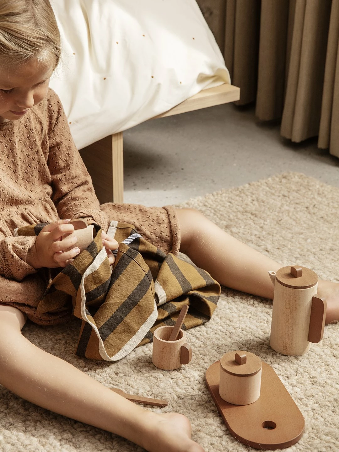 Designed by Ferm LivingManufactured by Ferm LivingThrow a tea party for all of your favourite teddies with the Toro Tea Set. This sweet set of toy utensils includes a tray, a teapot, two cups with spoons and a sugar jar made from natural beech wood with stained detailing to match the Toro play kitchen and provide a lovely contrast. The tray can be hung from the hooks of the play kitchen, and the whole set fits comfortably on the kitchen’s lower shelves.