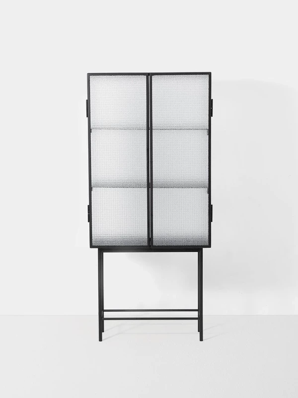 Designed by Ferm LivingManufactured by Ferm LivingOpposites attract on this freestanding cabinet, crafted from sleek powder coated metal and wired glass. The glass doors close seamlessly and quietly thanks to magnets, and open to reveal two powder coated metal shelves. Use in the bathroom to stylishly store beauty essentials or as a modern focal point in your dining room to store dinnerware and more.
