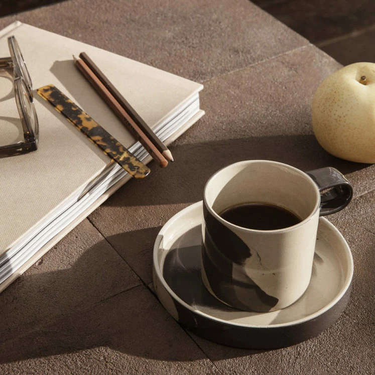 Designed by Ferm LivingManufactured by Ferm LivingPlaying with bold proportions, the Inlay Cup with Saucer is made from stoneware that features a distinctive, two-tone mix of clays that create a large-scale, marble-like pattern, each of which is unique to the individual piece. The purposeful, robust forms of the cup and saucer are pleasantly contrasted by a clear, high-gloss glazing. Use the oversized saucer along with the cup, or as a dish for your morning bread roll or afternoon pastry.