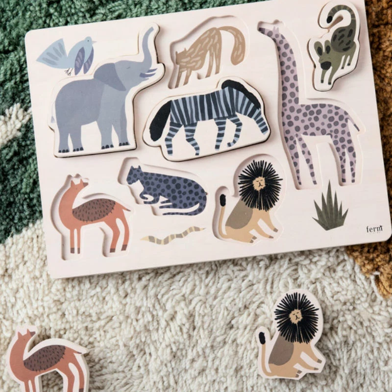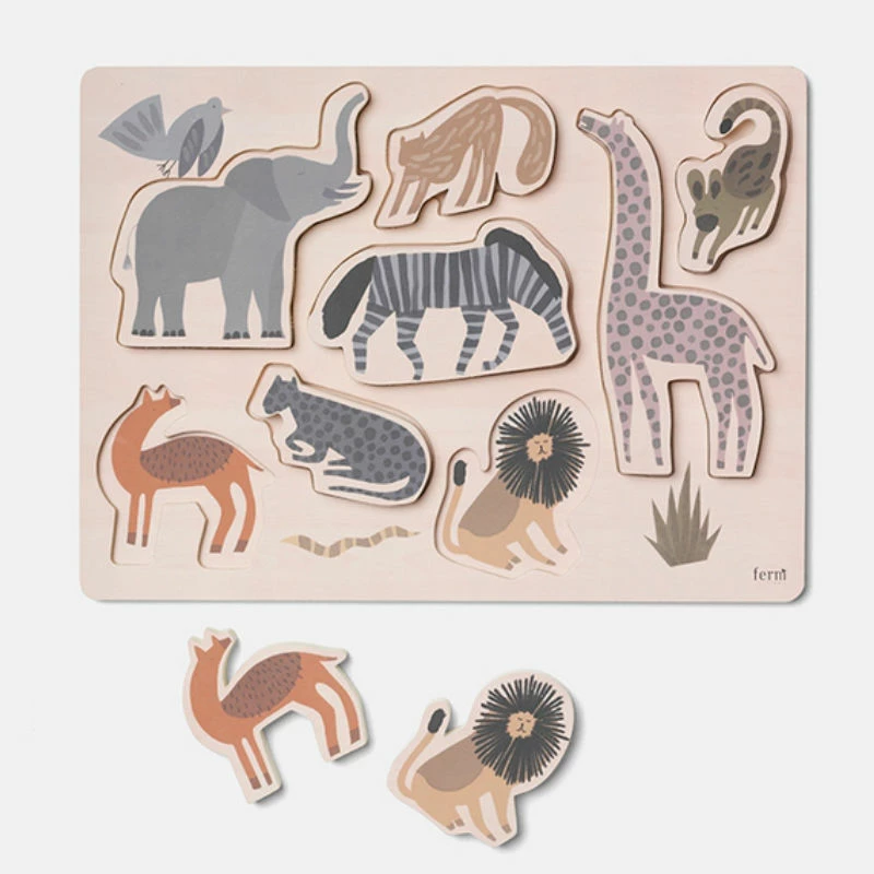 Designed by Ferm LivingManufactured by Ferm LivingEntertain your little ones with the wood puzzle with the wild animals of the Safari series. The durable puzzle is a great way of training their coordination while the subtle colours and natural wood add a stylish touch to your home.
