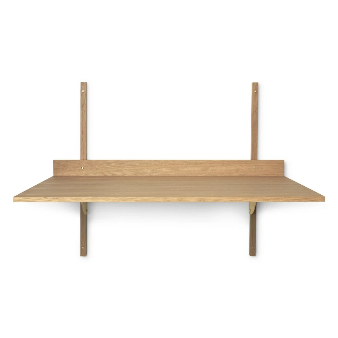 Designed by Ferm LivingManufactured by Ferm LivingA new and modern take on Mid-century shelving units, Sector is defined by its sturdy simplicity and classic combination of wood and brass. Use the Sector Desk as a standalone surface or combine it with the Sector Shelves of your choice to form one integrated and cohesive workspace. A short border at the end of the desk forms a small, narrow space that’s ideal for propping up hand-written notes or a favourite photograph. Choose between natural oak veneer or black stained ash veneer with brackets of either polished or blackened brass.