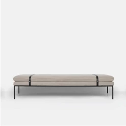 Designed by Ferm Living and Says WhoManufactured by Ferm LivingThe strict horizontal lines, along with its slim metal legs in powder coated metal, gives this daybed an elegant and light appearance. Fitted with two belts in black leather as a cool and modern detail, which adds to the high quality feel and holds the cushion firmly in place. Use the daybed with some of our many cushions and throws to give it a touch of your personality. The Turn daybed is available in several upholstery materials and colourways.