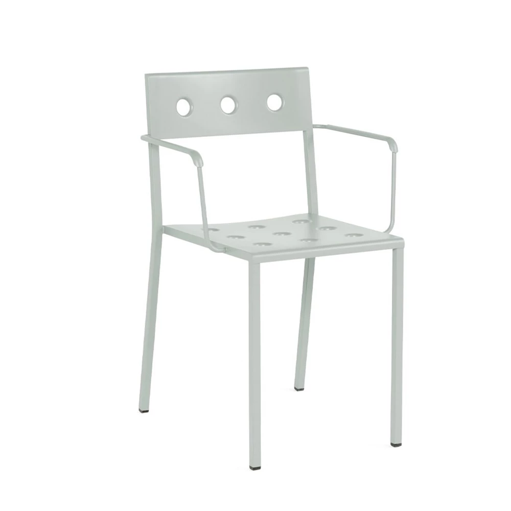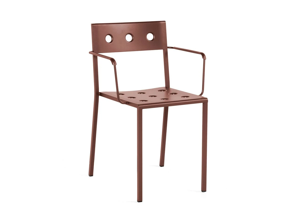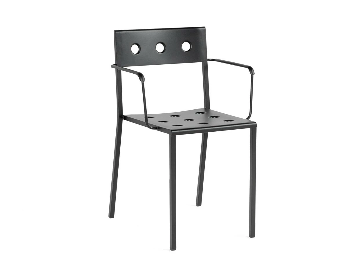 Designed by Ronan and Erwan BouroullecManufactured by HayDesigned for HAY by Ronan and Erwan Bouroullec, the Balcony Armchair is an elegant and functional dining chair with armrests for outdoor use. The square design is softened by the rounded back and slender armrests, with the multiple holes in the seat and back strengthening the construction, as well as creating a distinct expression. Made in powder-coated steel with an outdoor primer for optimal resilience and durability, Balcony is available in a number of different colour options. The chair’s stackable design means it is well suited to all kinds of spaces, from small balconies and terraces to gardens and other larger outside areas.