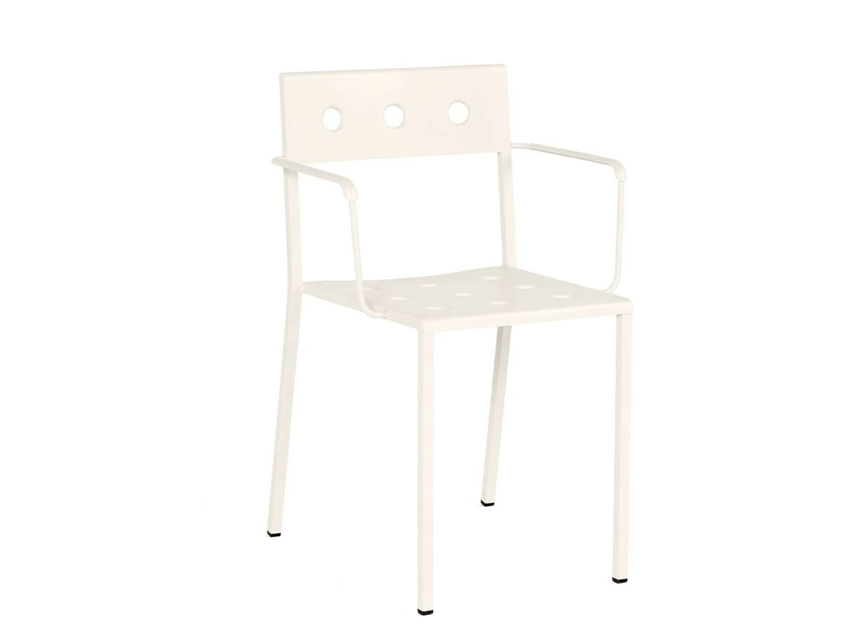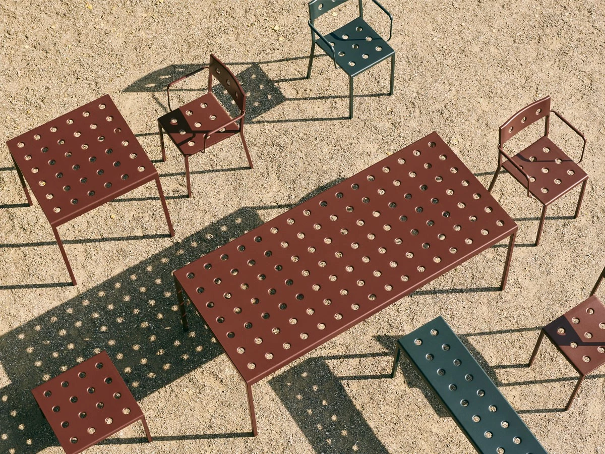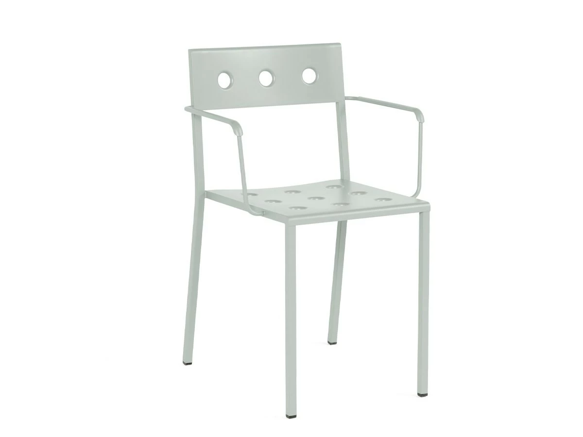 Designed by Ronan and Erwan BouroullecManufactured by HayDesigned for HAY by Ronan and Erwan Bouroullec, the Balcony Armchair is an elegant and functional dining chair with armrests for outdoor use. The square design is softened by the rounded back and slender armrests, with the multiple holes in the seat and back strengthening the construction, as well as creating a distinct expression. Made in powder-coated steel with an outdoor primer for optimal resilience and durability, Balcony is available in a number of different colour options. The chair’s stackable design means it is well suited to all kinds of spaces, from small balconies and terraces to gardens and other larger outside areas.