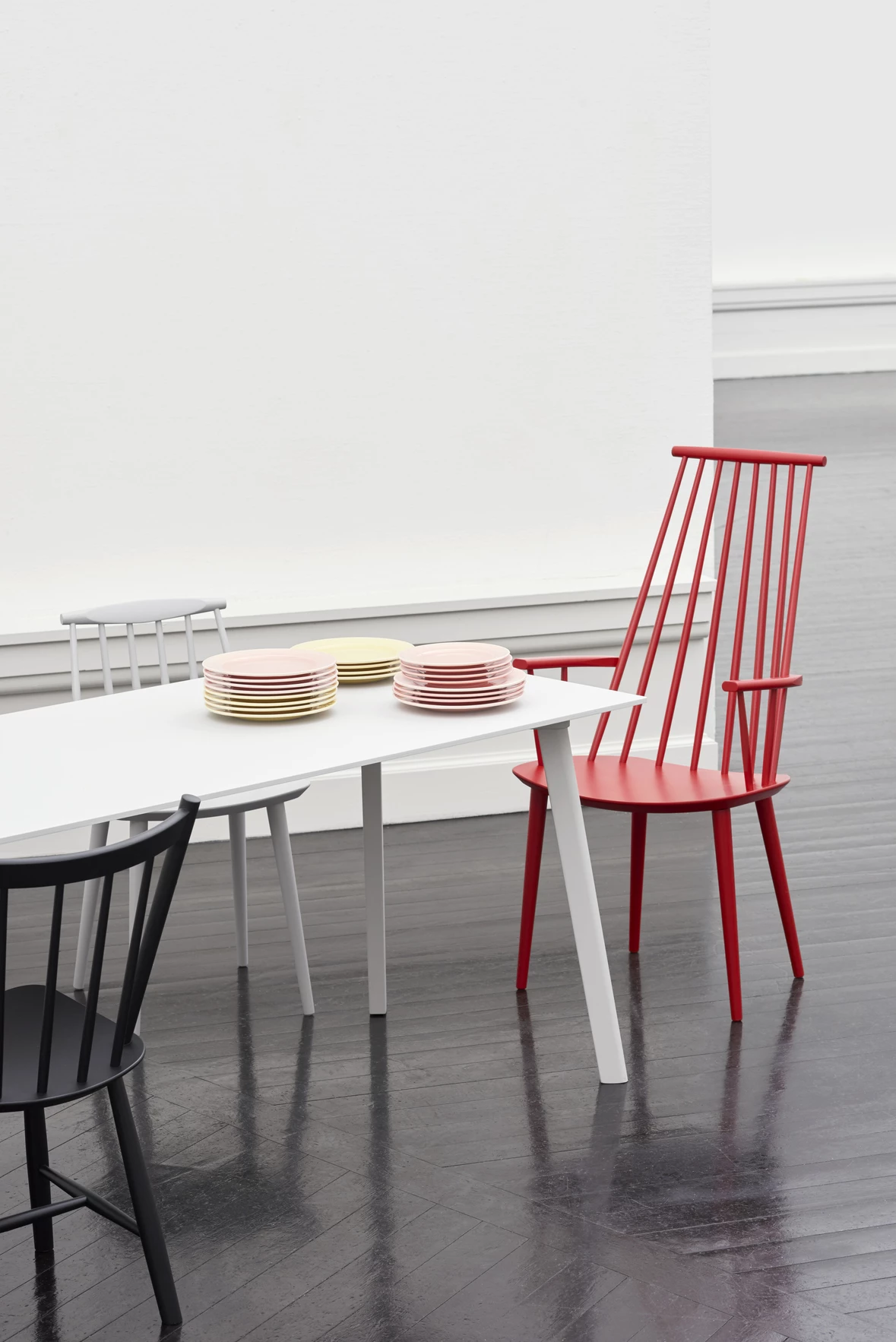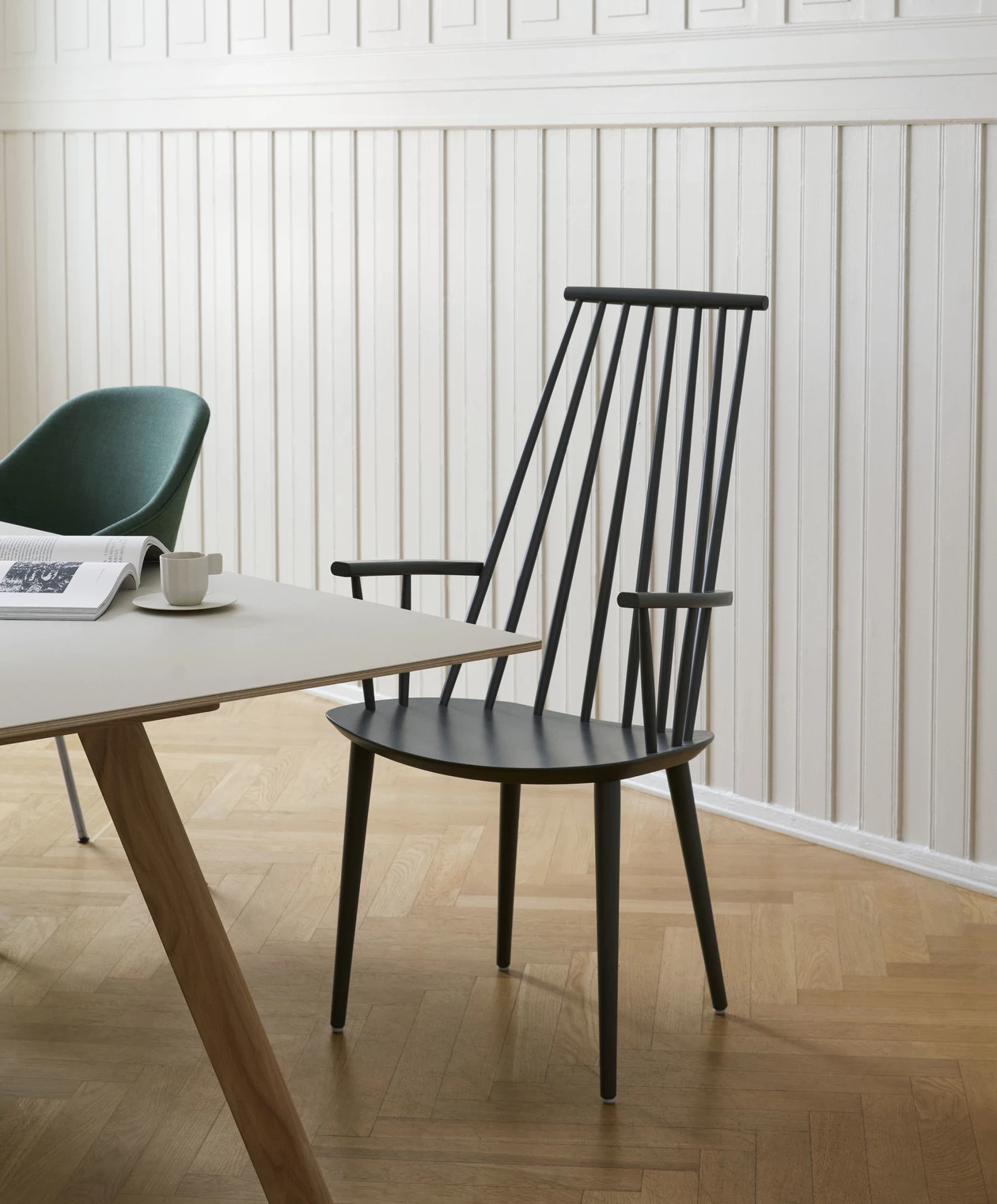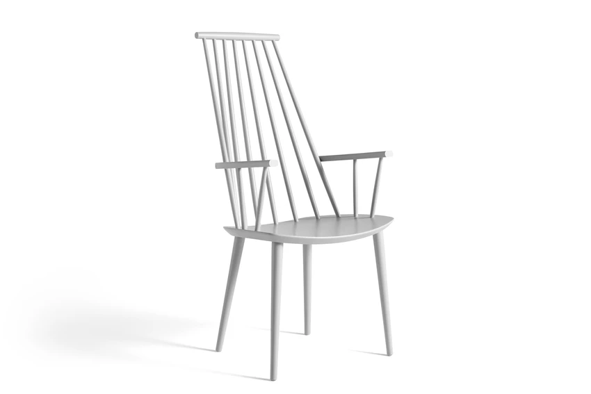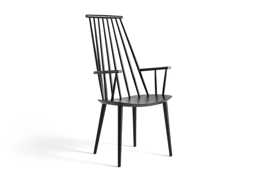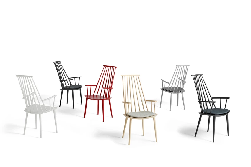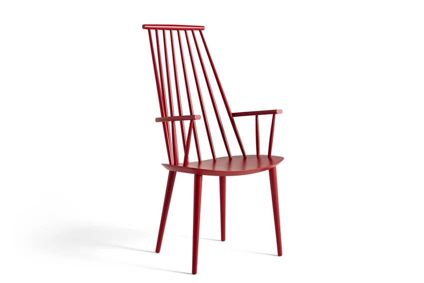 Designed by Poul M. VoltherManufactured by HayWith the comfort of a lounge chair and the functionality of a dining chair, HAY’s reproduction of Poul M. Volther’s J110 offers equal measures of strong aesthetics and practicality. Long rods at the back and curved armrests create an inviting expression. Crafted in solid beech with a natural finish or a variety of coloured finishes.