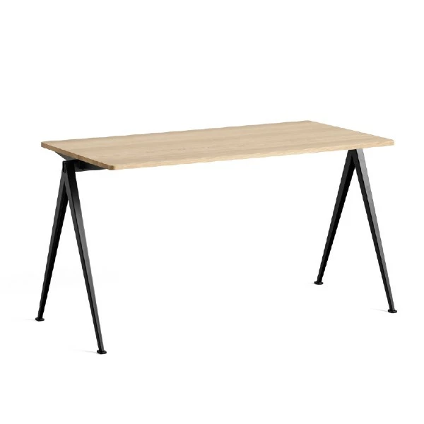 Designed by Friso Kramer & Wim RietveldManufactured by HayDesigned to be functional, light and strong, the Pyramid Table features a steel-sheet base with a rectangular oak tabletop. Originally created by Wim Rietveld while working at Ahrend in the 1950s, the cutout steel collection has been relaunched by HAY together with Ahrend. The table comes in two models – with and without overhang – and is suitable for using in a wide range of educational institutions, corporate environments and private homes. Both variants are available in a variety of wood finishes and base colours that can be coordinated with the Result Chair.