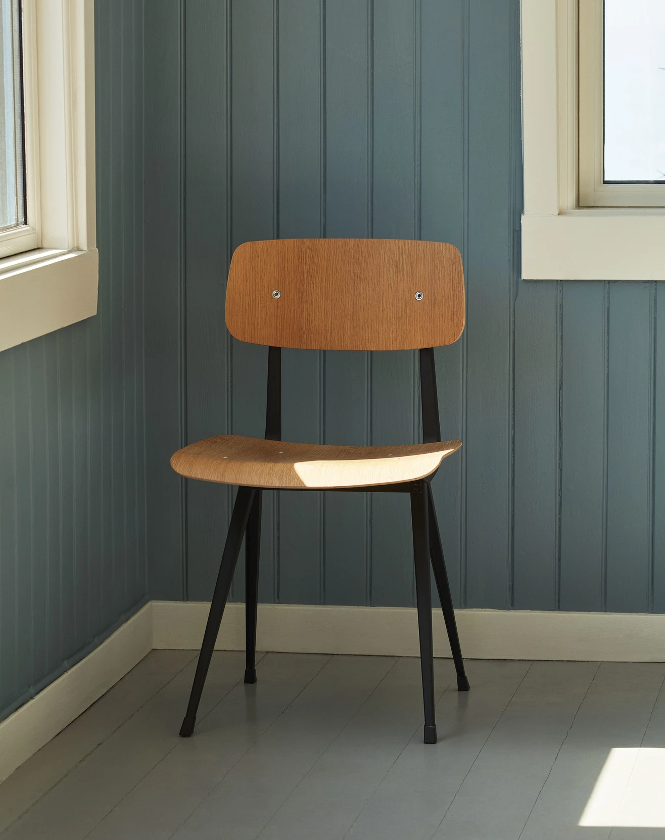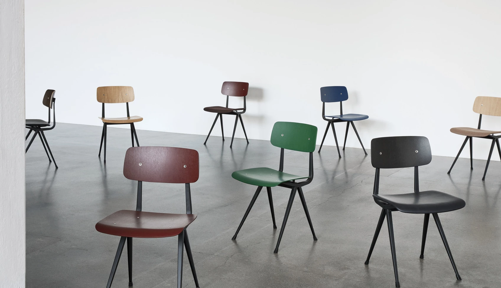 Designed by Friso Kramer & Wim ReitveldManufactured by HayThe Result Chair features a thin steel-sheet base with an oak seat and backrest, retaining maximum flexibility, lightness and strength. Originally created by Friso Kramer and Wim Rietveld while working at Ahrend in the 1950s, the cutout steel collection has been relaunched by HAY together with Ahrend. Suitable for use in many public and private contexts, it is available in a variety of wood finishes and base colours that can be coordinated with the Pyramid Table.