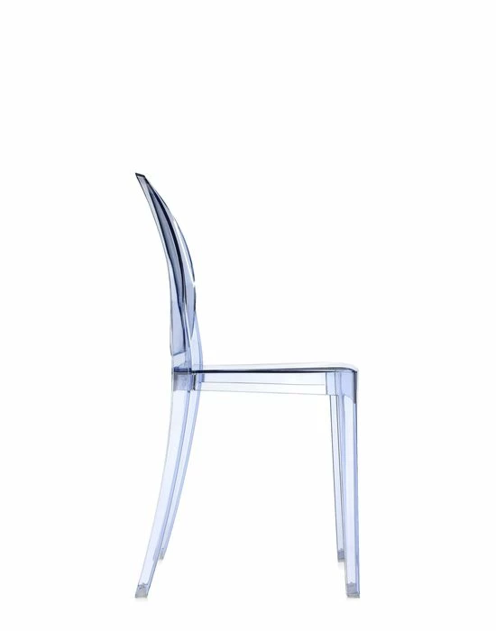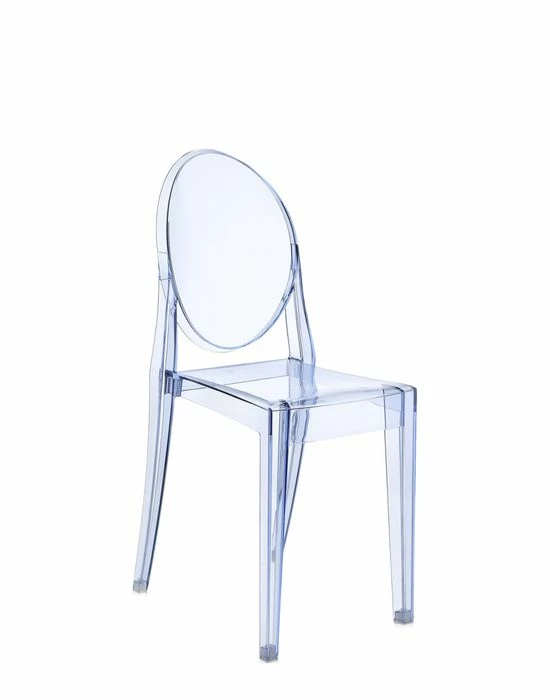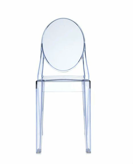 Designed by Philippe StarckManufactured by KartellThis is a chair born of classic lines with a rounded backrest that recalls the shape of antique medallions. Victoria Ghost is made of transparent, coloured polycarbonate and formed in a single injection mould. It is stable, comfortable, robust and weather resistant. It is an article with great charm and personality which fits elegantly into any style of surrounding.