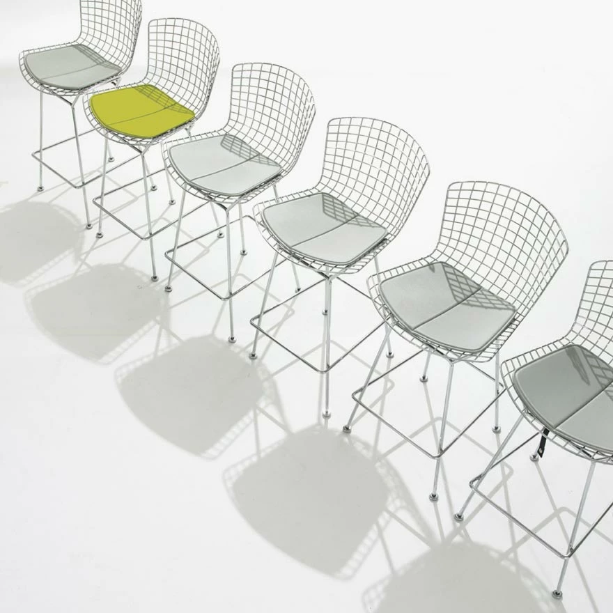 Designed by Harry BertoiaManufactured by KnollThe Bertoia collection includes a side chair, bar stool, counter height stool, bench, lounge chair, armchair, high back armchair and asymmetric armchair and has been in continuous production around the world since its introduction.Characteristic of the early environment at Knoll, Hans and Florence never demanded that Bertoia design furniture, but instead encouraged him to explore whatever he liked. They simply asked that if he arrived at something interesting, to show them. Bertoia later explained the process: “I went around and discovered, quite soon, that I was not the man to do research. My feeling was that had to come from an inward direction. I began to rely once more on my own body. I began to think in terms of what I would like as a chair. It started very slowly…I came into rod or wire, whether bent of straight. I seemed to find myself at home. It was logical to make an attempt utilizing the wire.Bertoia may be upholstered in a range of fabrics selected by Knoll. Please see materials section below or enquire for further details.