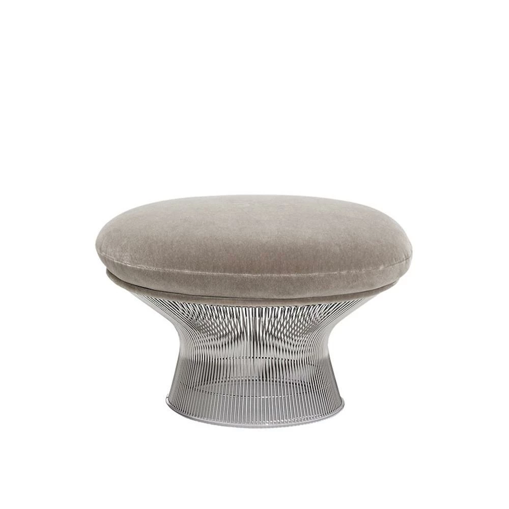 Designed by Warren PlatnerManufactured by KnollIn 1966, the Platner Collection captured the ‘decorative, gentle, graceful’ shapes that were beginning to infiltrate the design world. This Platner Ottoman, designed as the ultimate companion to the Platner Easy Chair, is finished in polished nickel, upholstered in Knoll’s Rivington fabric and created by welding hundreds of curved, steel rods to circular frames, simultaneously serving a structural and decorative purpose.Platner may be upholstered in a range of fabrics selected by Knoll. Please see materials section below or enquire for further details.