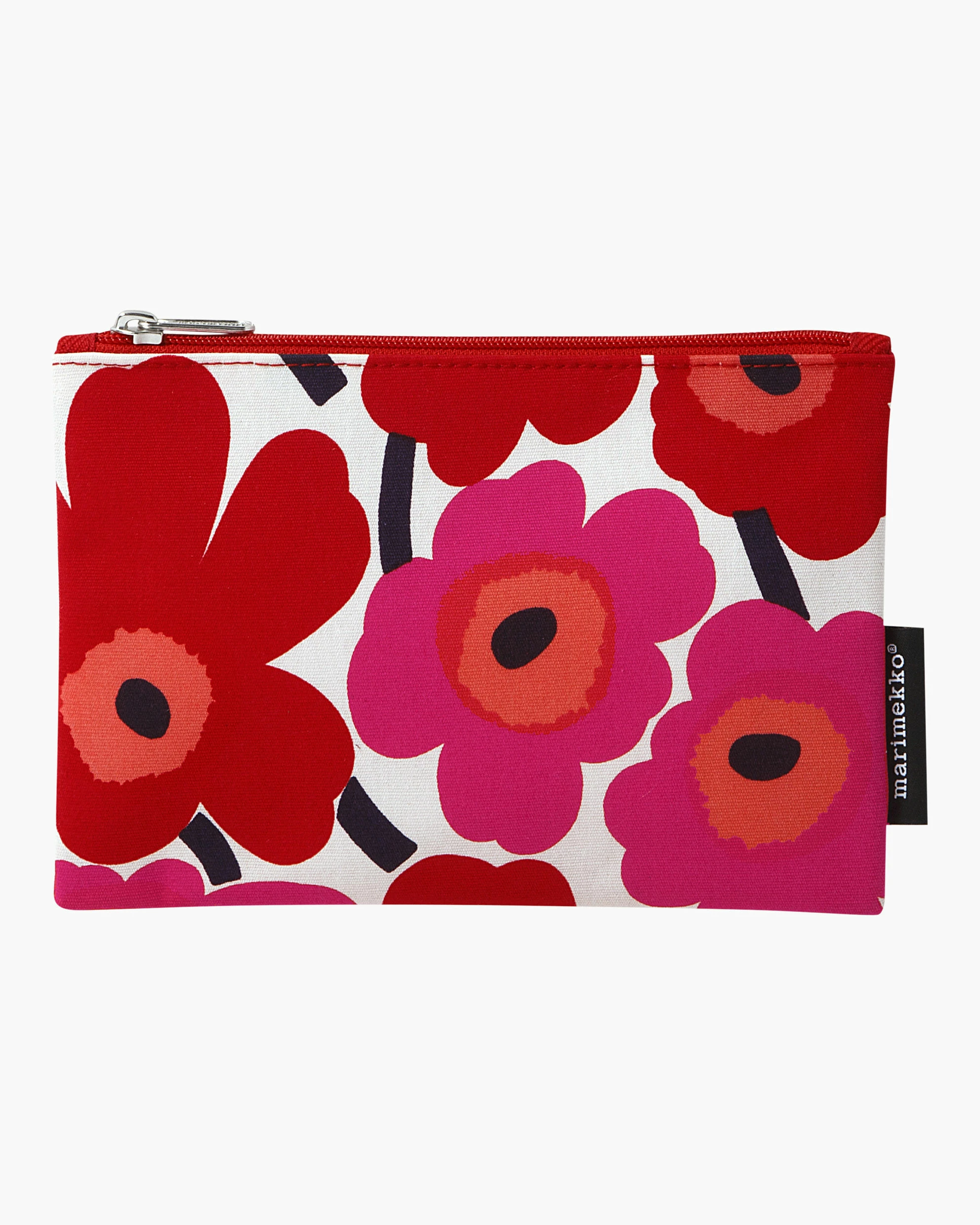 Designed by Maija IsolaManufactured by Marimekko. The Kaika cosmetic pouch is made of heavyweight cotton and it is decorated with the Mini Unikko (poppy) pattern, which is printed in Helsinki. The pouch has a nylon lining, dirt repellant on the fabric and a zipper closure.