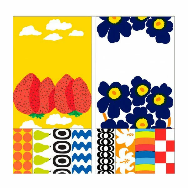 Designed by MarimekkoManufactured by MarimekkoThis set of sticky notes includes two notepads, one with the Unikko (Poppy) pattern and the other Mansikkavuoret (Strawberry Hills), as well as eight pads of page flags in various Marimekko prints. The set is bundled in a Kaivo portfolio with a string-tie closure.