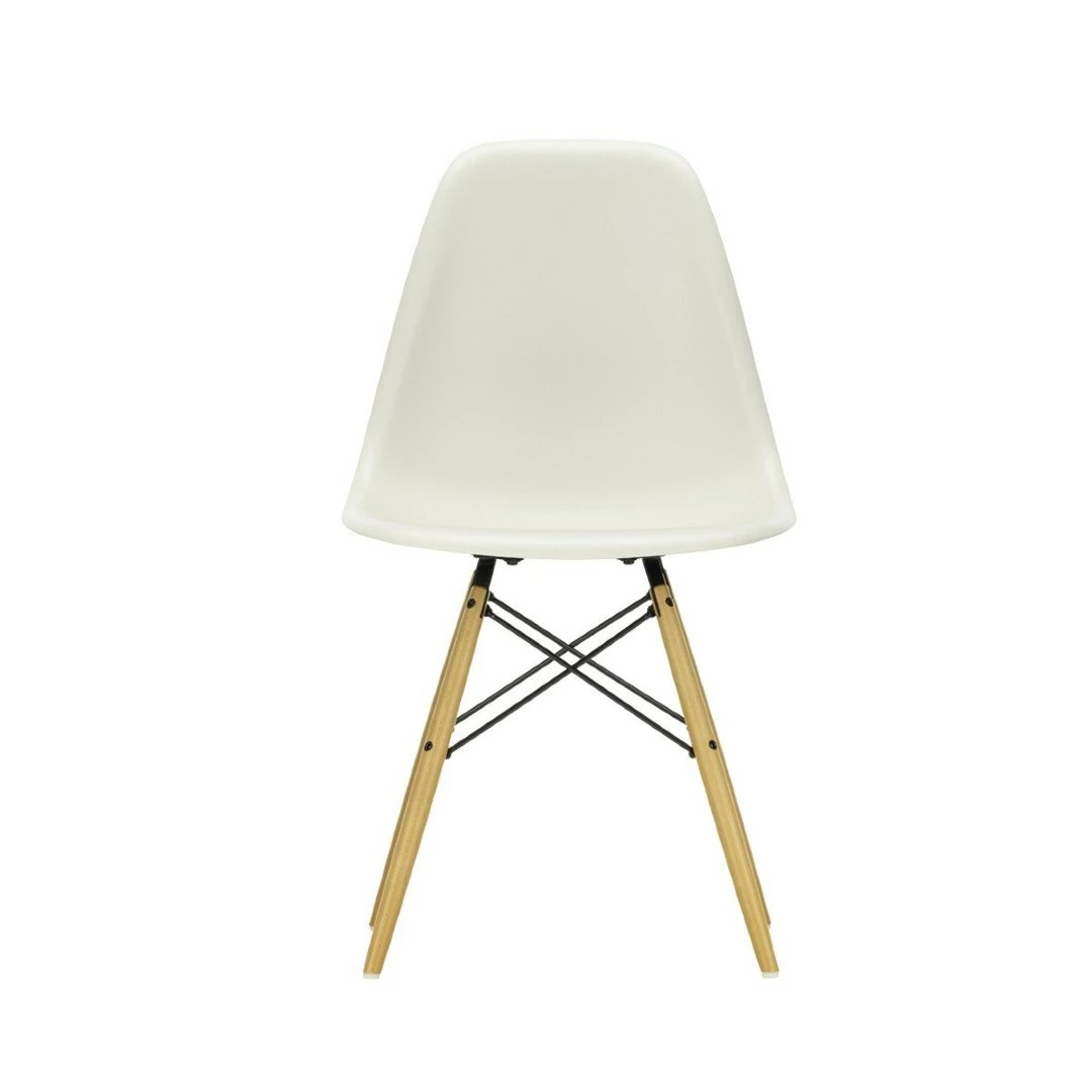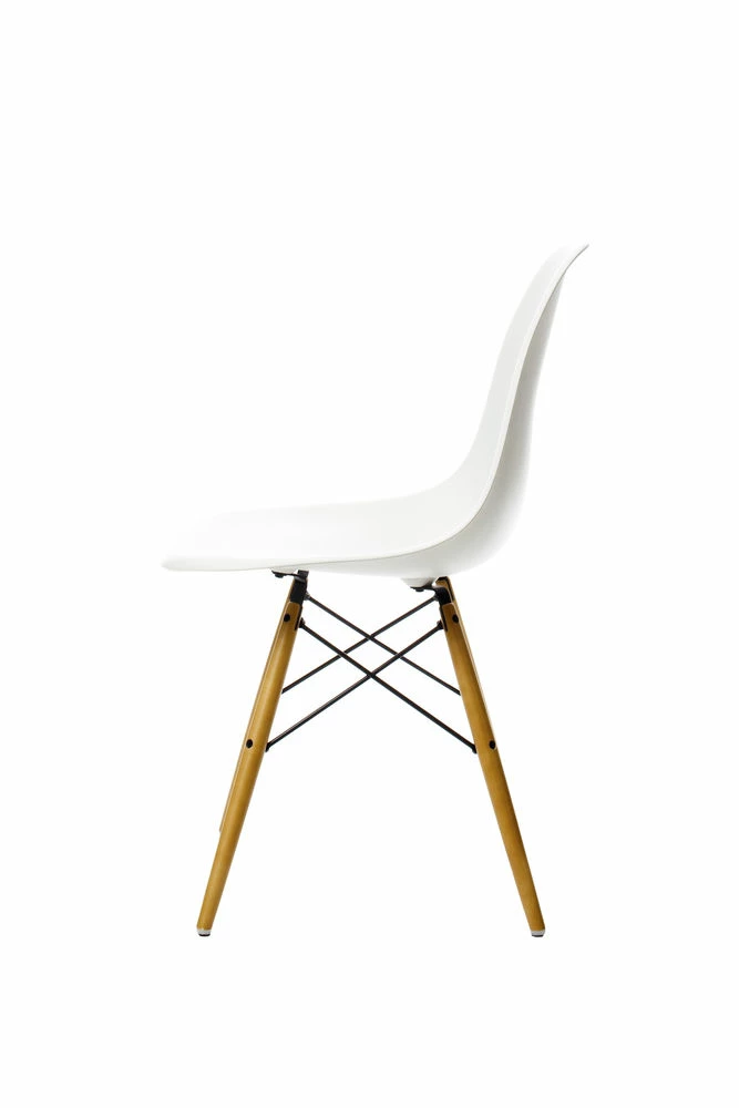 Designed by Charles and Ray Eames Manufactured by Vitra For the Dining Height Side Chair Wood Base (DSW), Charles and Ray Eames combined the organically shaped seat shell with a four-legged wooden base. Beautifully crafted the back rest hugs the body. A beautiful piece that would sit firm in any room.For base options and upholstering enquiries please contact a member of the team.