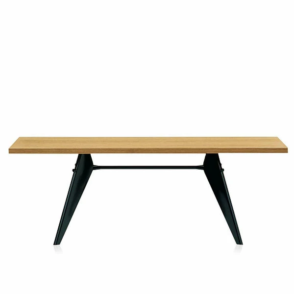 Designed by Jean ProuvéManufactured by VitraJean Prouvé designed the EM Table at the beginning of the 1950s for the ‘Maison-Tropique’ project.With every single detail governed by its construction, the EM Table follows the aesthetics of necessity. It illustrates the force vectors and static connections more commonly seen in the context of civil engineering works. A natural oiled wood table top is combined with a moulded sheet steel base, creating a distinctive interplay of materials, resulting in a one-of-a-kind dining table that will last for generations to come.