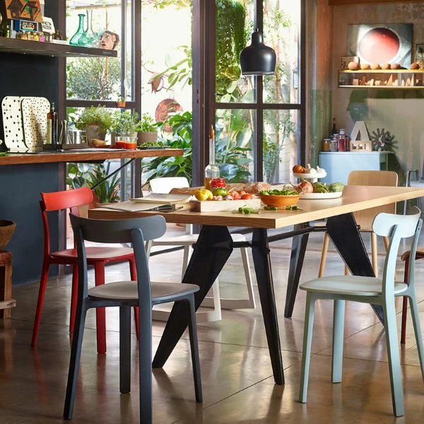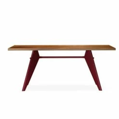 Designed by Jean ProuvéManufactured by VitraJean Prouvé designed the EM Table at the beginning of the 1950s for the ‘Maison-Tropique’ project.With every single detail governed by its construction, the EM Table follows the aesthetics of necessity. It illustrates the force vectors and static connections more commonly seen in the context of civil engineering works. A natural oiled wood table top is combined with a moulded sheet steel base, creating a distinctive interplay of materials, resulting in a one-of-a-kind dining table that will last for generations to come.