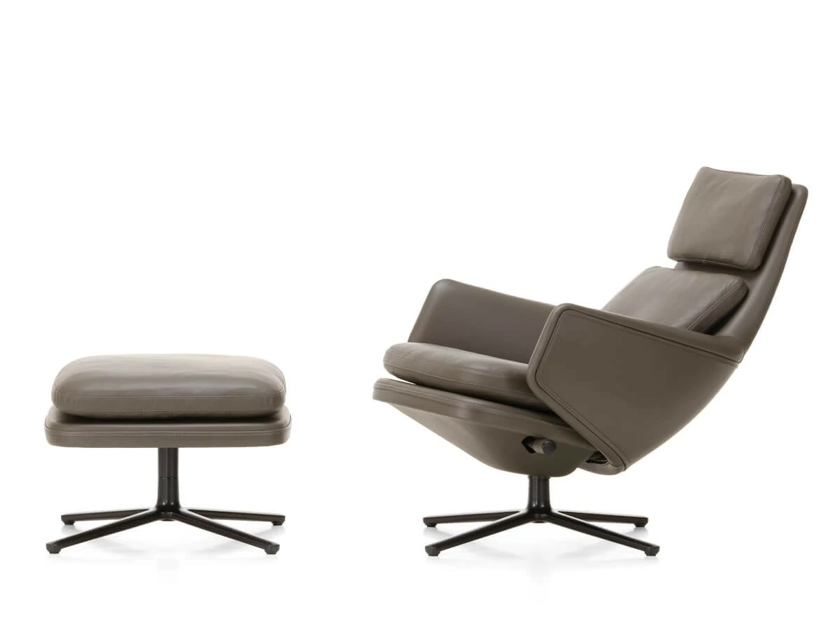 Designed by Antonio CitterioManufactured by VitraGrand Relax is a luxurious reclining lounge chair combining outstanding comfort with compact dimensions and a classic understated aesthetic. High-quality leather covers encase the soft seat and back cushions, which sit loosely on the lounge chair and snugly envelop the sitter. When sitting down, the user sinks slowly into the cushions, while a concealed integrated mechanism absorbs the weight and moves the chair into a reclined position. The seat and backrest move independently in synchronised motion. A control knob can be rotated to adjust the resistance of the mechanism, and the backrest can be locked at any angle. Mounted on an elegant four-star base made of aluminium, the lounge chair can be rotated 360°.Grand Relax may be upholstered in a range of fabrics selected by Vitra. Please see materials section below or enquire for further details.